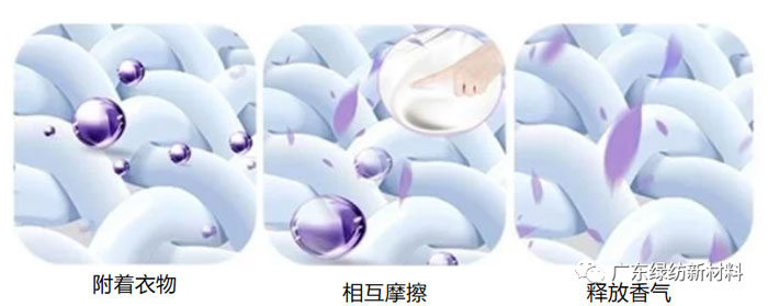 香味胶囊整理后的织物经摩擦、拍打、揉搓,受外力作用后,微胶囊破损,香气外溢,即可闻到芬芳的花香,如无外力作用,微胶囊则不破损,香味持久保存,永不消失。