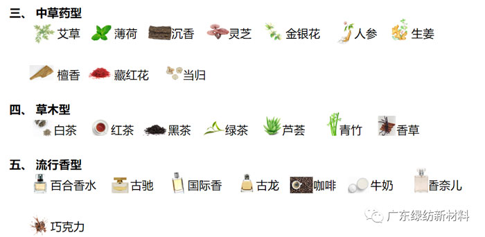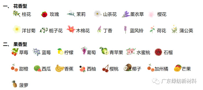 主要香型有薄荷、玫瑰、艾草、香草、藏红花、茉莉花、樱花、栀子花等,消除织物异味,香味持久清新。