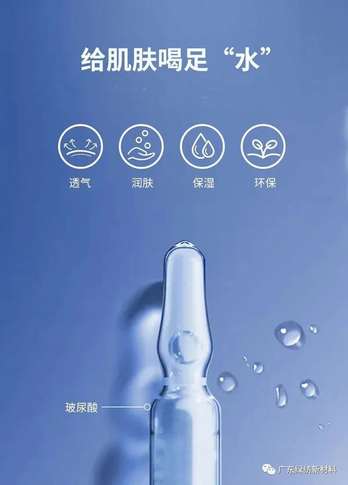 玻尿酸的锁水能力非常好,1克玻尿酸可以吸收500ml水分,是胶原蛋白的16倍。正因为玻尿酸可以吸取大量水分,且在任意气候、环境下作用于任何肌肤,都具有高保水性,所以在织物整理剂中添加玻尿酸,可以有效保持皮肤的含水量并重建水脂保护膜,让皮肤更加水